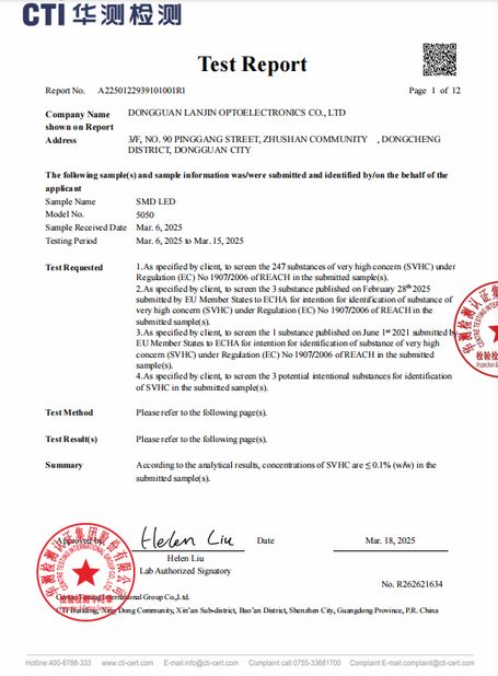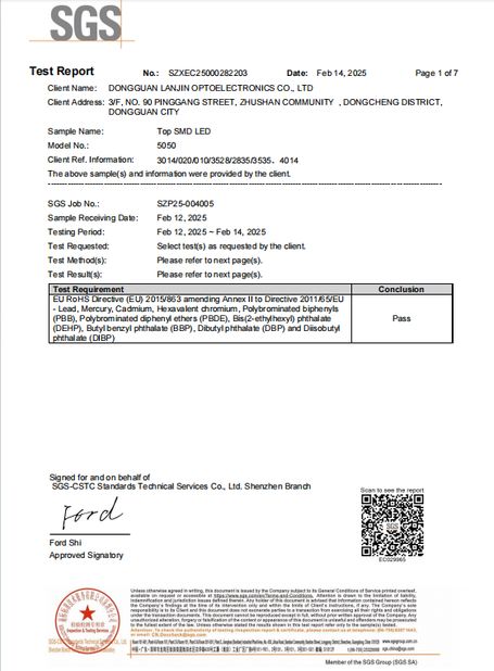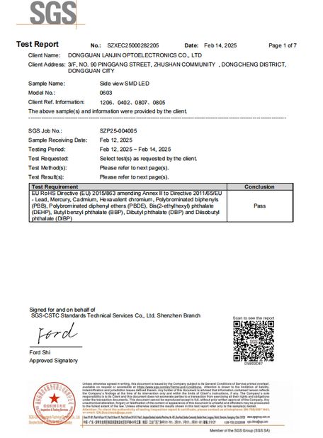 Standard:RoHS Number:SZXEC25000282206 Issue Date:2025-02-14 Expiry Date:2025-02-15 Scope/Range:0402/0603/0805/1206 SMD LED Issued By:SGS-CSTC Standards Techical Services Co., Ltd Guangzhou Branch |